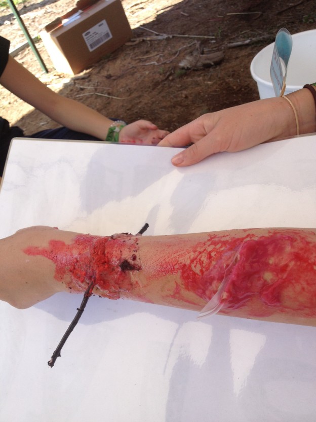 - Täällä saa maskeerata erilaisia haavoja. Ohjeita löytyy pisteeltä, mutta leiriläisillä itsellään on ollut todella hyviä ideoita, Henna kiitteli.