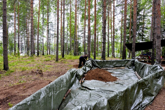 Mutapainipisteen valmistelevia töitä. Paikalle tuotu multa siirretään mutapainialtaan viereen.